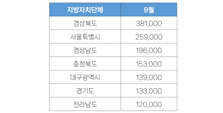 - 구독자 증감을 확인해보면, 서울특별시가 한 달 동안 1.3만 명이 증가하는 성과를 달성했습니다. 뒤를 이어 경상남도 경기도, 전라남도 등도 적지 않은 구독자 증가 성과를 달성했습니다.