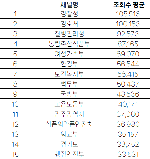 *이 수치는 게재한 영상 수와 조회수를 비교한 것으로 얼마나 많은 영상을 게재했는지는 확인되지 않습니다. - 한 개 영상 중 가장 많은 조회수를 이끌어낸 기관은 경찰청으로 나타났습니다. 경찰청은 현장영상을 활용한 영상 콘텐츠를 다수 게재하고 있으며, 이들 영상이 대부분 높은 조회수를 기록하고 있어 당연한 결과라고 볼 수 있습니다.