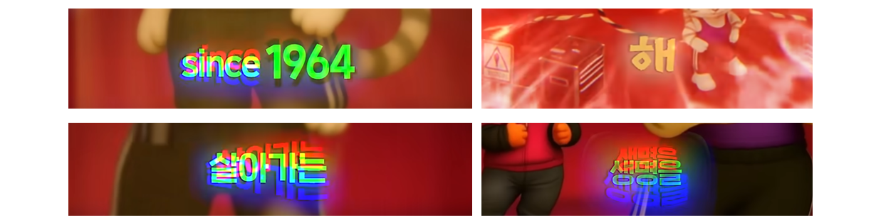 - 단순히 가사를 텍스트로 노출시키는 구성이 아니라, 랩과 영상의 스타일을 반영하여 가사에도 화려한 모션을 추가하여 전반적으로 영상에 어울리도록 추진했습니다.