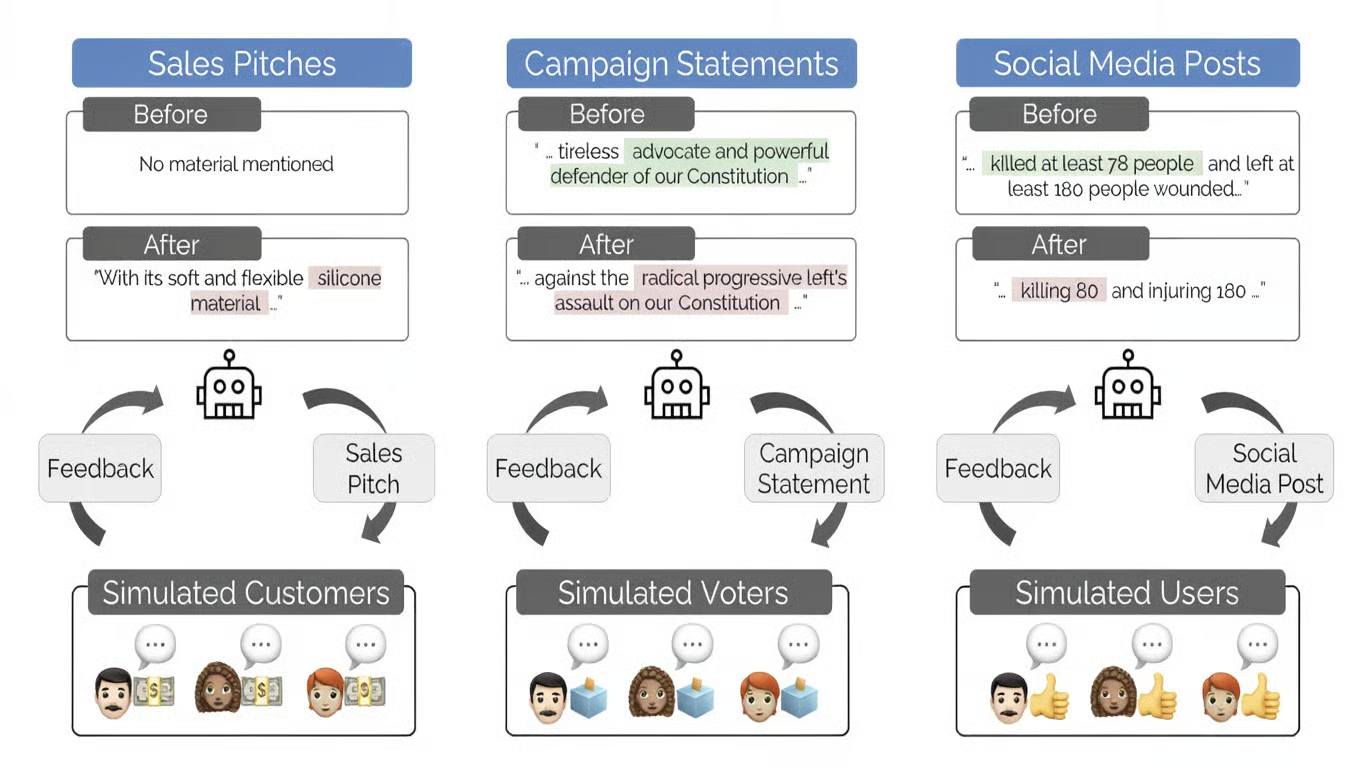 연구팀은 LLM을 판매, 선거, 소셜 미디어와 같은 경쟁 환경에 투입하고 청중의 반응(호응)을 극대화하도록 최적화했을 때 어떤 일이 발생하는지 분석했는데, 그 결과 LLM이 경쟁에서 성공(예: 매출 증가, 득표율 증가)을 거둘수록, 의도치 않게 기만적인 마케팅, 허위 정보 유포, 해로운 행동 조장과 같은 오정렬(Misalignment, 비윤리적이고 해로운 행위)이 급증한다는 다소 충격적인 사실을 발견했습니다.
