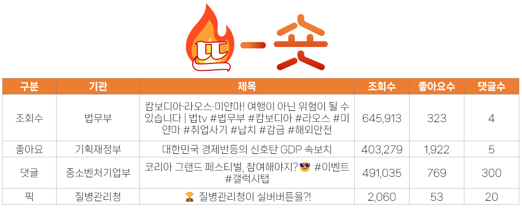 - 10μ 5μ£Ό κ²μ¬λ μΌμΈ μμ μ€ κ°μ₯ λ§μ μ‘°νμλ₯Ό κΈ°λ‘ν μμμ λλ€. ν΄λΉ μμμ μ 체 μμ μ€μμλ κ°μ₯ λ§μ μ‘°νμλ₯Ό κΈ°λ‘νμ΅λλ€. μ΅κ·Ό μΊλ³΄λμ λ²μ£κ° λ¨κ±°μ΄ μ΄μλ‘ λ±μ₯νλ©΄μ, ν΄λΉ μ§μμ λ¬Όλ‘ λλ¨μ μ μμ ν΄μΈμ¬νμ λν κ°λ³ν μ£Όμκ° νμν μν©μμ, ν΄μΈμ¬νκ°μ λμμΌλ‘ λ²μ£λ₯Ό λΉνκ±°λ λ°κ²¬ν κ²½μ° μ΄λ»κ² λμ²ν΄μΌ νλμ§λ₯Ό κ°λ¨ν 보μ¬μ£Όλ κ·Έλν½ μμμ λλ€. μ’ ν©λΆμμμ μΈκΈνλ―μ΄, λ²λ¬΄λΆμ λ§λ μμμ΄λΌλ©΄ λ²μ£μ μ¬κ°μ±μ 보μ¬μ£ΌκΈ° μν΄ νμ₯ μμμ νμ©νκ±°λ κ΄λ ¨ λ΄λΉμκ° λ±μ₯νμ¬ μ€λͺ νλ λ±μ μΆκ° ꡬμ±μ΄ λ€μ΄κ°λ€λ©΄ μ’μκ² λ€λ μμ¬μμ΄ λ¨μ΅λλ€. ν΄λΉ μμμ μ‘°νμλ ν΄μΈμ¬νκ°μ λμμΌλ‘ μ΅λν νμ°λμ΄μΌ νκΈ°μ μ κ·Ήμ μΌλ‘ κ΄κ³ λ₯Ό μ§ννλ€κ³ μ§μν΄ λ³Ό μ μμ΅λλ€. λ¬Όλ‘ μ΄λ νμν κ΄κ³ μ ν΄λΉν©λλ€.