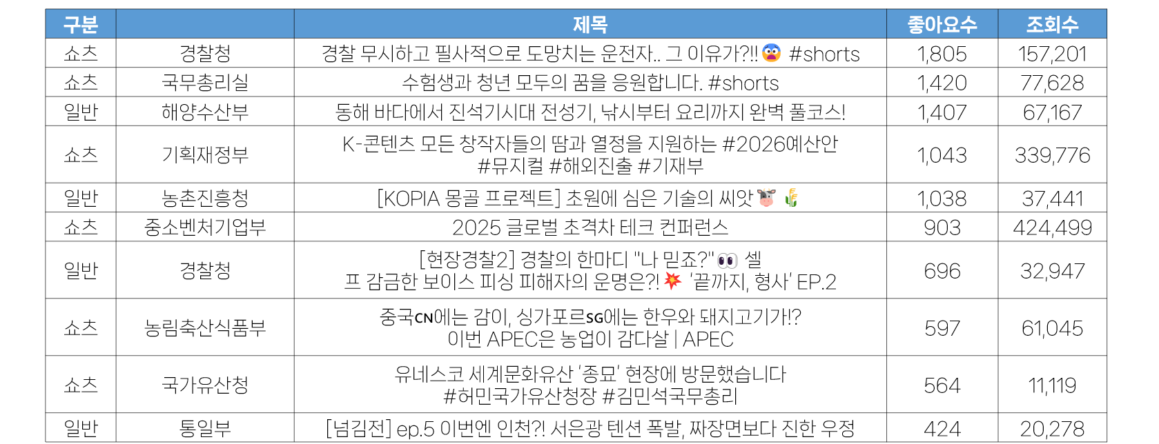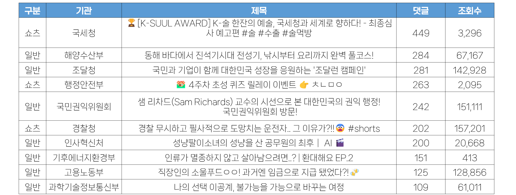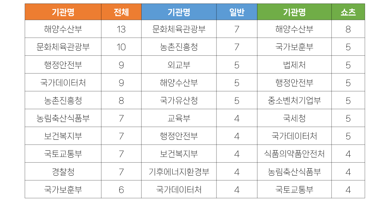 - 일반영상은 문화체육관광부와 농촌진흥청이 7건으로 가장 많은 수를 게재했으며, 쇼츠영상은 해양수산부가 8건을 게재했습니다.