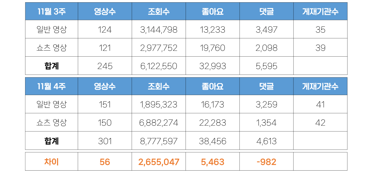- 좋아요의 경우 일반영상의 조회수는 감소했으나 좋아요는 지난 주 대비 오히려 증가한 것을 확인할 수 있었으며, 댓글 수는 비슷했습니다. 좋아요를 더 클릭할만한 영상 요소가 있었다 라고 분석해볼 수 있겠습니다. 쇼츠영상은 좋아요는 지난 주 대비 증가한 반면 댓글은 크게 감소했습니다. 조회수가 급증한 것에 비해서는 그 증가폭이 크지 않은 것을 확인할 수 있습니다.