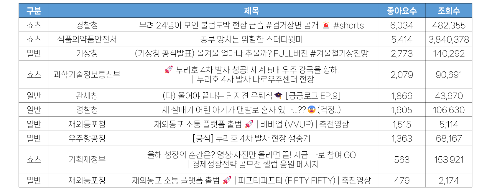 - 더불어 눈에 띄는 영상은 바로 기상청 <(기상청 공식발표) 올겨울 얼마나 추울까? FULL버전 #겨울철기상전망>으로, 조회수도 높지만 좋아요와 댓글 수도 함께 높은 성과를 달성했다는 점입니다. 유튜브 내에서는 이벤트가 확인되지 않은 상황에서, 기상 예보라는 다소 재미 없는 영상에 대해 이 정도의 높은 관심이 모였다는 것은 매우 이례적인 성과라고 볼 수 있습니다.