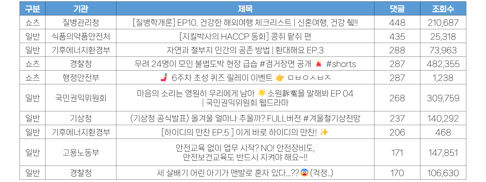 - 11월 4주 가장 많은 댓글의 영상은 질병관리청 <[질병학개론] EP10. 건강한 해외여행 체크리스트 | 신혼여행, 건강 췤‼️>으로, 수집일 기준 448개를 기록했습니다. 질병관리청에서 꾸준히 게재하고 있는 웹드라마 시리즈로, 이벤트와 함께 진행해 다수의 참여를 이끌어 냈습니다. 쇼츠영상임에도 많은 수의 댓글을 확보했다는 점이 눈에 띕니다.