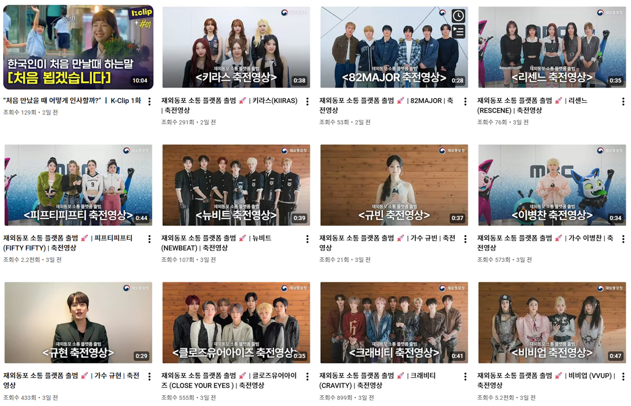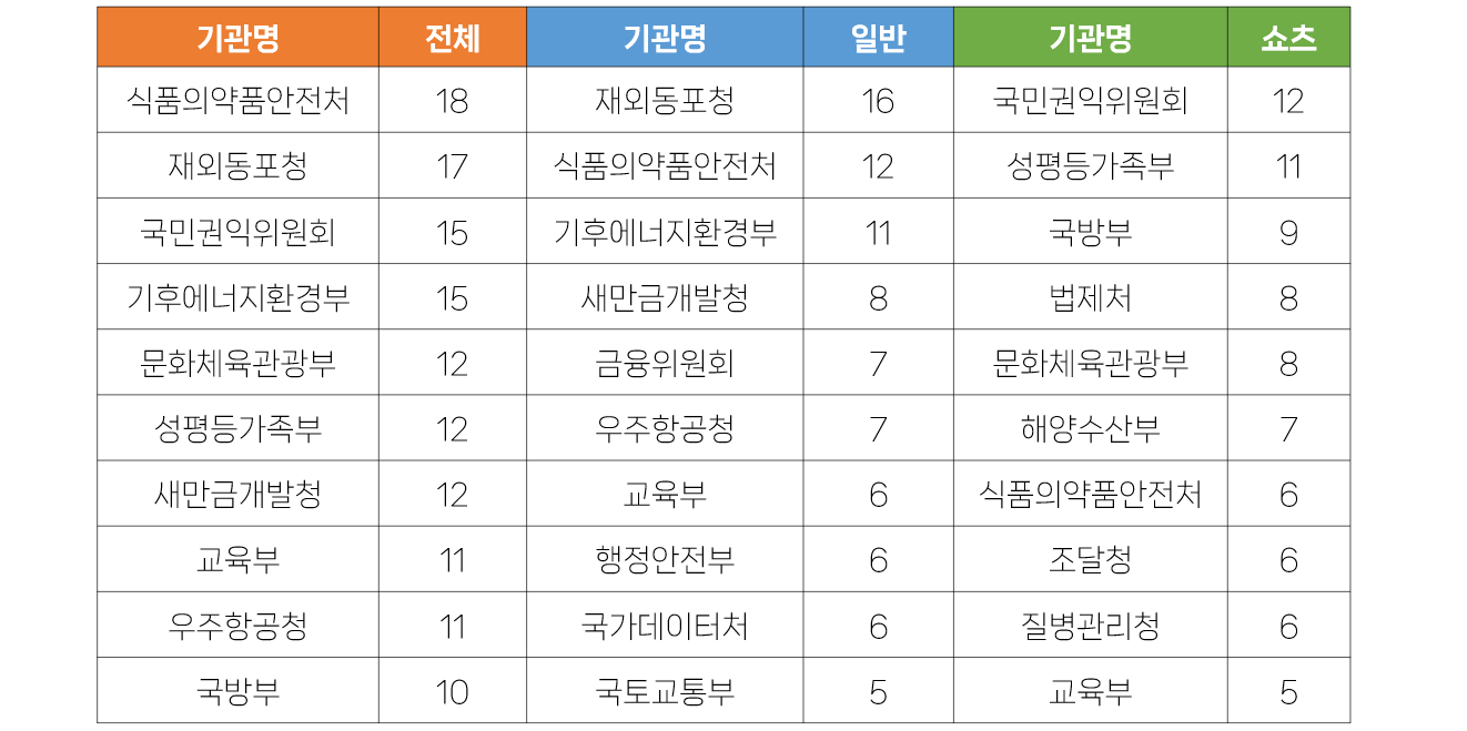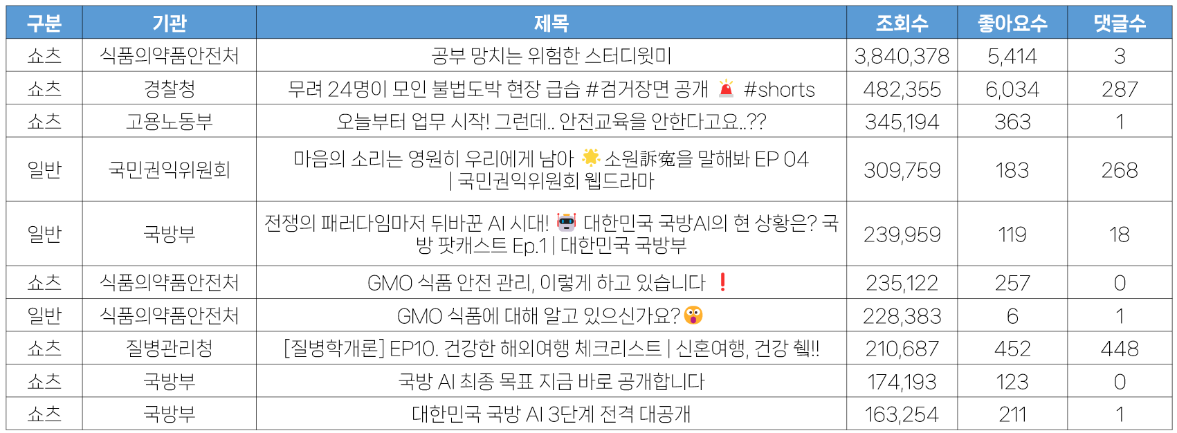 - 일반영상 중에서는 재외동포청이 총 16건으로 가장 많은 수량을 기록했습니다. 재외동포 소통 플랫폼을 축하하는 연예인들의 영상이 다수 게재된 것을 확인할 수 있었습니다. 쇼츠영상은 국민권익원회가 12건으로 가장 많았는데, 일반영상으로 게재한 웹드라마를 재편집한 영상이 다수를 차지했습니다.