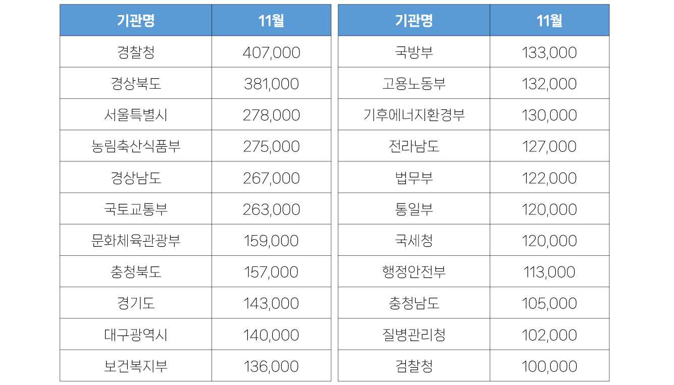- 2025년 11월 말 기준 가장 많은 구독자를 확보한 기관은 경찰청으로, 수집일 기준 40만 7천명을 기록했습니다. 경찰청은 중앙행정기관과 광역자치단체 유튜브 중에서 유일하게 40만 명의 구독자를 확보하고 있는 유일한 기관입니다. 뒤를 이어 경상북도가 38만 명으로 경찰청을 바짝 따라잡고 있는 상황입니다.