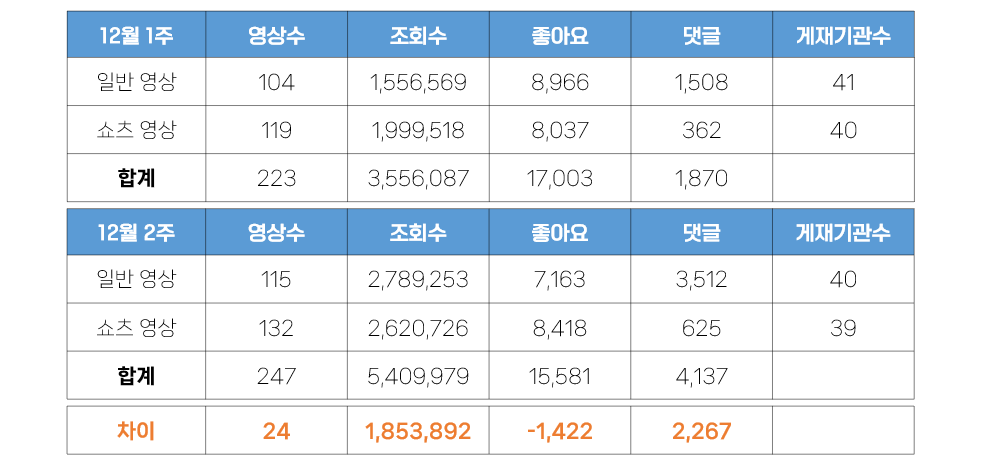 - 2025년 12월 2주 중앙행정기관 유튜브 채널에 게재된 영상 분석 결과, 한 주간 게재된 영상 수는 총 247건으로 지난 주 대비 24건 상승했습니다. 일반영상과 쇼츠영상 고루 증가했으며, 영상을 게재한 기관 수에는 큰 변화가 없었습니다.
