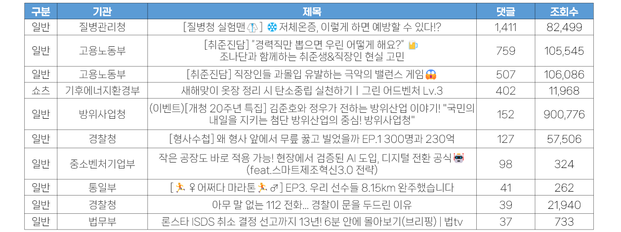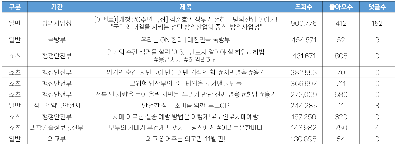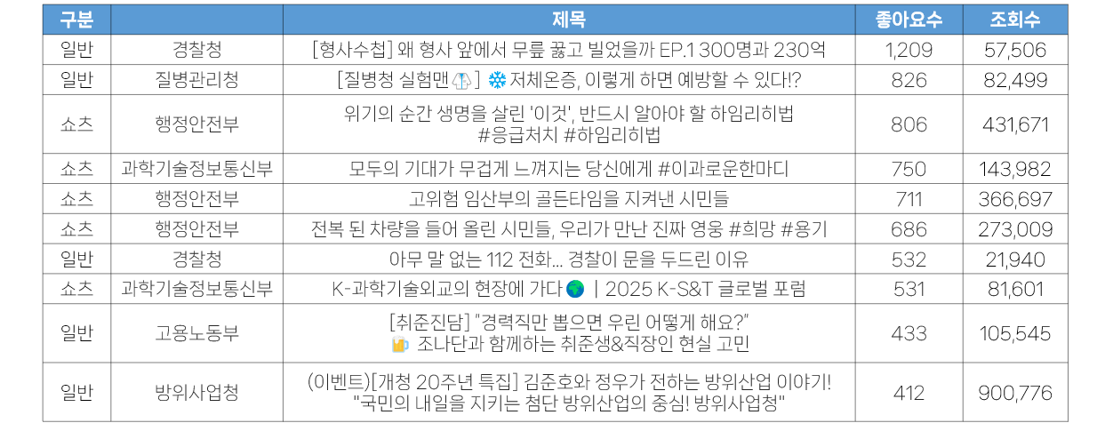 - 상위 10개 영상 중 현장영상을 활용한 행정안전부의 쇼츠영상 4건이 좋은 성과를 기록한 것도 눈에 띕니다. 경찰청에 이어 현장영상을 오리지널 콘텐츠로 활용하는 사례가 될 수 있을 것으로 보입니다.
