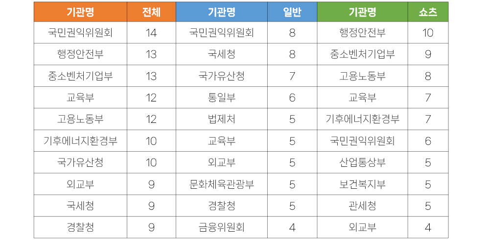 - 전체영상 중에서 가장 많은 영상 수를 기록한 기관은 국민권익위원회로 총 14건을 기록했습니다. 이 중 일반영상이 8건을 차지했습니다. 권익위에서 매년 진행하는 청렴콘텐츠 공모전 영상을 게재한 영향입니다. 뒤를 이어 행정안전부와 중소벤처기업부가 13건, 교육부, 고용노동부가 12건의 영상을 게재했습니다. 다른 기간 대비 10건 이상의 영상을 게재한 기관의 수가 많았습니다.