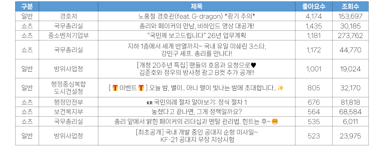 - 12월 4주 영상 중 가장 많은 좋아요 수를 기록한 영상은 경호처에서 여러 차례 예고를 했던 <노홍철 경호관(feat. G-dragon) 광기 주의>입니다. 8월 이후 매우 파격적인 활동을 추진하고 있는 경호처가 다시 한 번 시청자들에게 놀라움을 전달하며 매우 좋은 성과를 이뤄낼 수 있었습니다. 영상에 대한 분석을 추후 진행할 에정이지만, 최근 경호처가 추진하고 있는 사실 기반의 솔직함과 노홍철이 가지고 있는 이미지가 결합되면서 시너지를 발생시킬 수 있었던 것으로 분석됩니다. 다른 기관의 경우 연예인, 인플루언서 등과의 협업 영상이 좋은 성과를 이뤄내지 못하는 것을 비교해봐도, 좋은 성과라는 것을 알 수 있습니다.