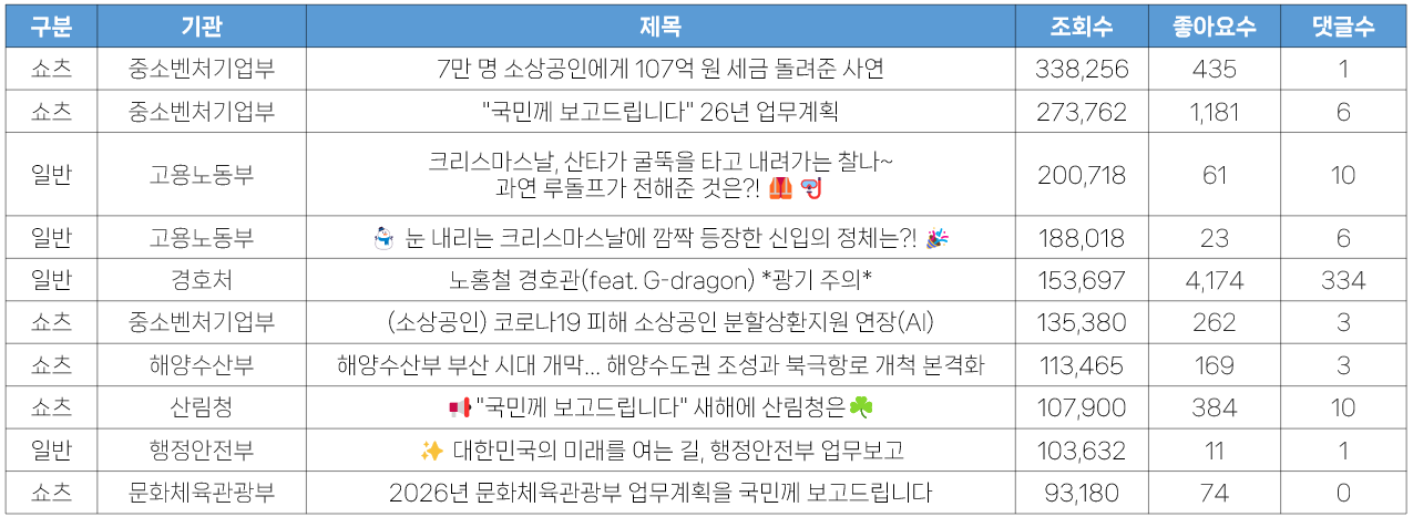 - 일반영상은 농림축산식품부가 9건으로 가장 많았으며, 쇼츠영상은 국무총리실이 8건이었습니다. 농림축산부는 구제역 정보를 전달하는 영상을 다국어로 번영하여 다수 게재했으며, 특히나 12월 4주에는 김민석 국무총리의 동정 쇼츠영상이 다수 게재되었습니다.
