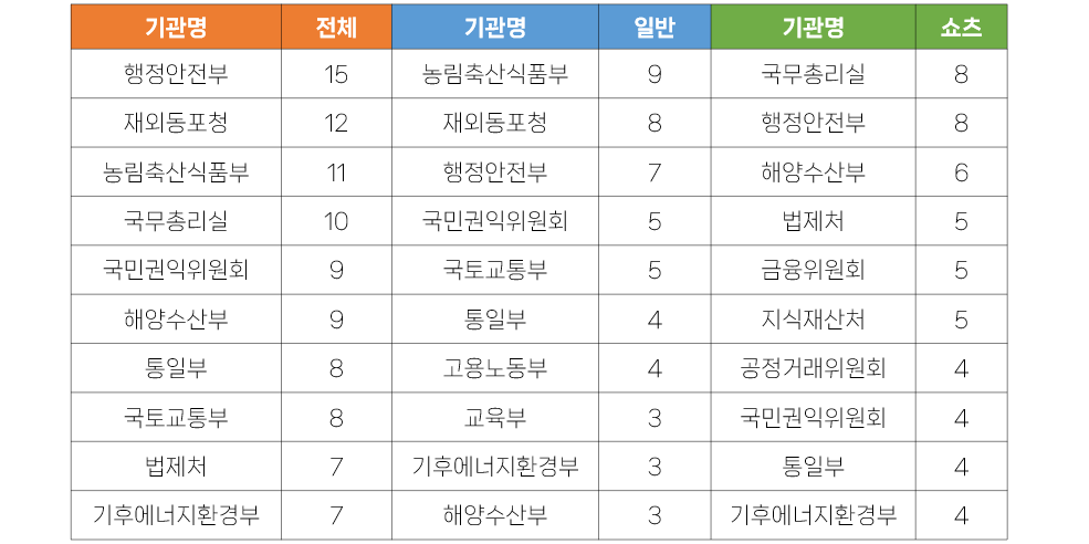 - 전체영상 중에서는 행정안전부가 15건으로 가장 많은 영상을 게재했습니다. 이 중 일반영상은 7건, 쇼츠영상은 8건이었습니다. 행졍안전부에서는 일반영상과 쇼츠영상으로 국민의례에 대한 정보를 전달하는 영상을 각각 3건씩 게재한 부분이 눈에 띄었습니다. 뒤를 이어 재외동포청도 122건의 영상을 게재했는데, 최근 진행하고 있는 K팝 라이브 영상의 영향으로 확인됩니다.