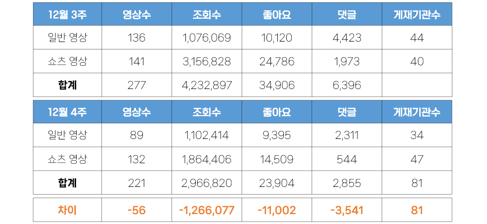 12월 4주 기간 동안 중앙행정기관 유튜브에서 게재한 영상은 총 몇 건일까요? 각 기관별 주 평균 몇 건의 영상을 게재하고 있으며, 이들 영상은 기관의 홍보 방향에 얼마나 도움이 되고 있는지 확인해보도록 하겠습니다.