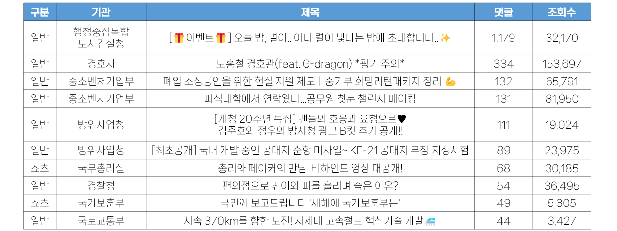 - 무슨 이야기냐면, (공공기관을 대상으로 했을 때) 조회수의 경우에는 광고를 다수 집행한 영상이 상위에 오르고 있으며, 댓글 수는 이벤트를 진행하고 참여를 잘 유도한 기관의 영상이 상위에 선정되는 것을 확인할 수 있습니다.