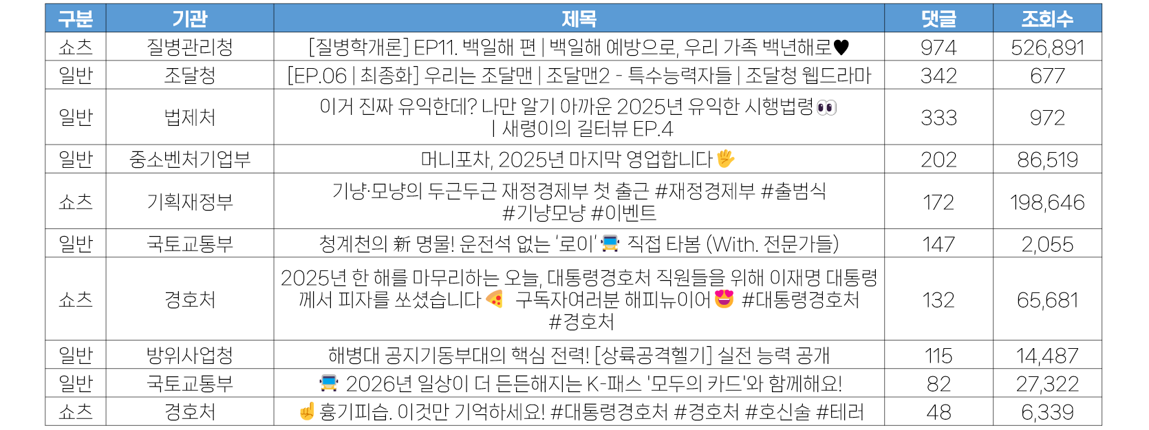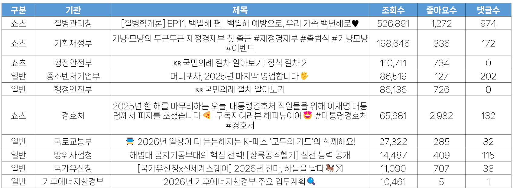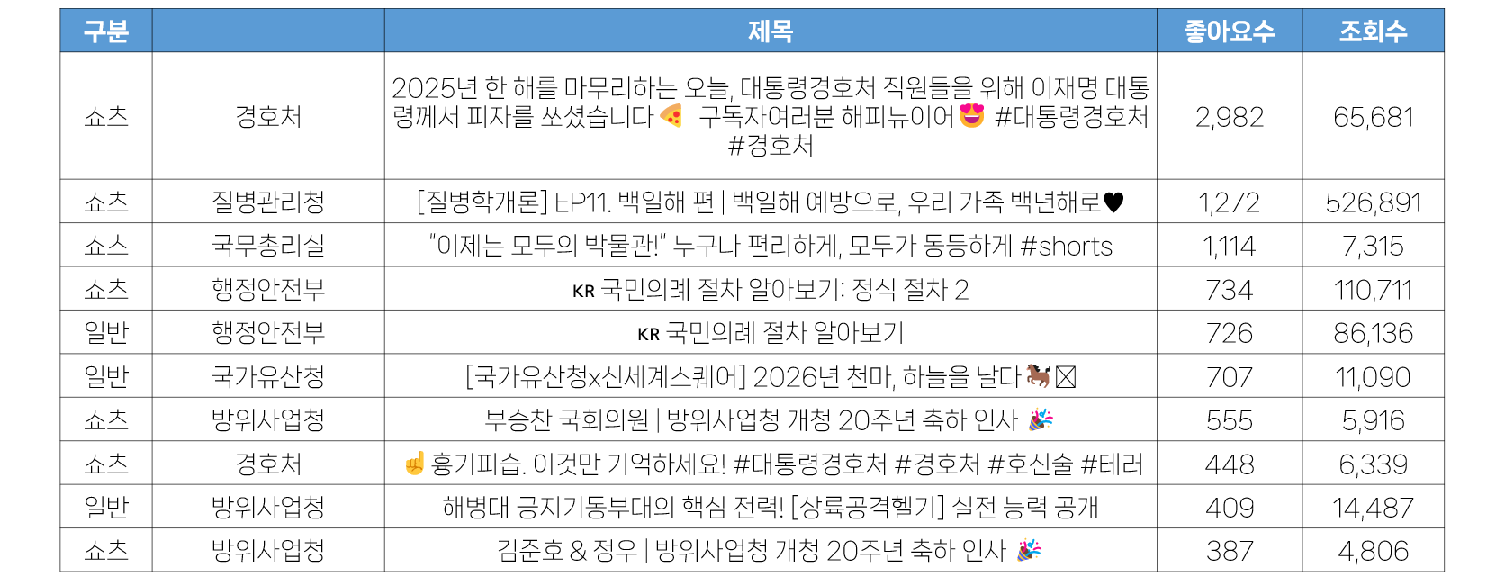 - 12월 5주 가장 많은 좋아요 수는 경호처 <2025년 한 해를 마무리하는 오늘, 대통령경호처 직원들을 위해 이재명 대통령께서 피자를 쏘셨습니다🍕 구독자여러분 해피뉴이어😍 #대통령경호처 #경호처> 쇼츠영상으로, 수집일 기준 약 3천 개에 달했습니다. 경호처의 경우 솔직한 영상과 소통으로 최근들어 가장 긍정적인 반응을 모으고 있는 기관입니다. 이번 쇼츠영상 역시 단순히 피자를 선물 받는 영상이지만, 이재명 대통령이 선물해 준 것이라는 것을 강조하는 가감없는 영상이 더 좋은 반응을 이끌어 낼 수 있었던 것으로 보입니다.