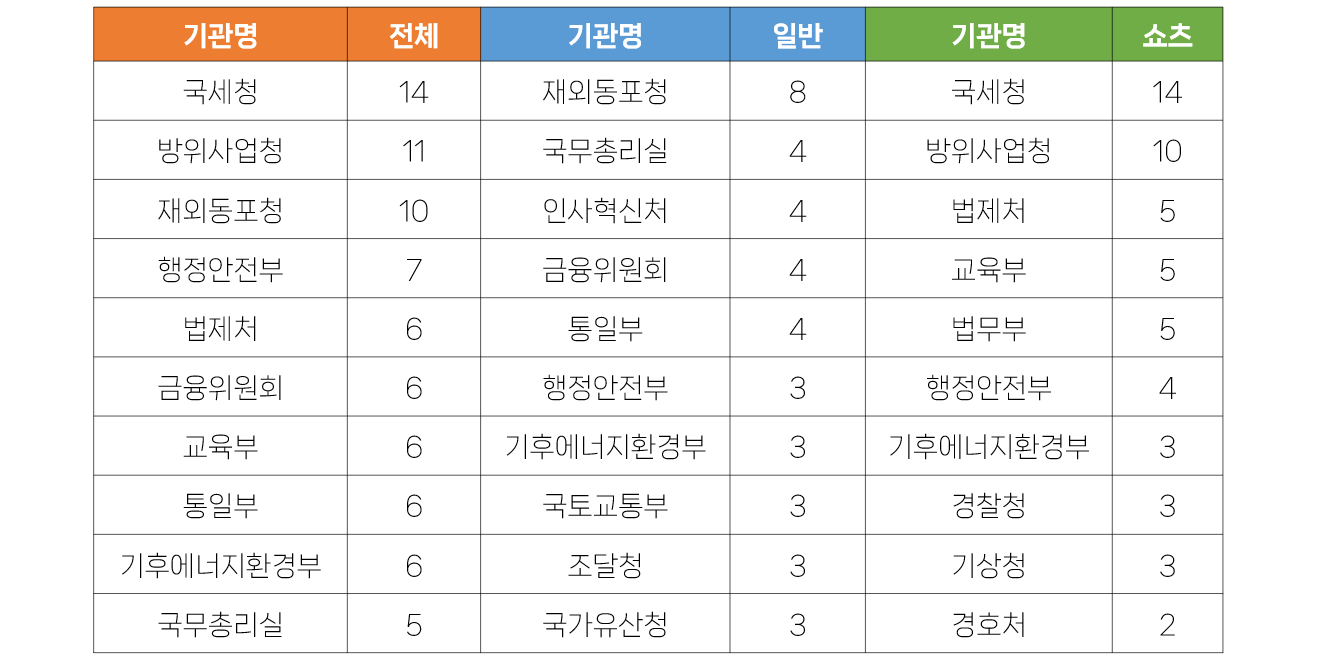 - 전체영상 중에서는 국세청이 14건으로 가장 많았습니다. 특이한 것은 14건 모두가 쇼츠영상이라는 점입니다. 국세청의 가장 큰 대목(?)이라고 할 수 있는 연말정산을 앞두고, AI로 제작한 쇼츠영상을 다수 게재했습니다. 더불어 방위사업청과 재외동포청도 11건, 10건의 영상을 게재했습니다. 재외동포청은 일반영상을 8건, 방위사업청은 쇼츠영상을 10건 게재했습니다. 방위사업청은 개청 20주년을 축하하는 다수의 축하인사 영상이 게재되었습니다.
