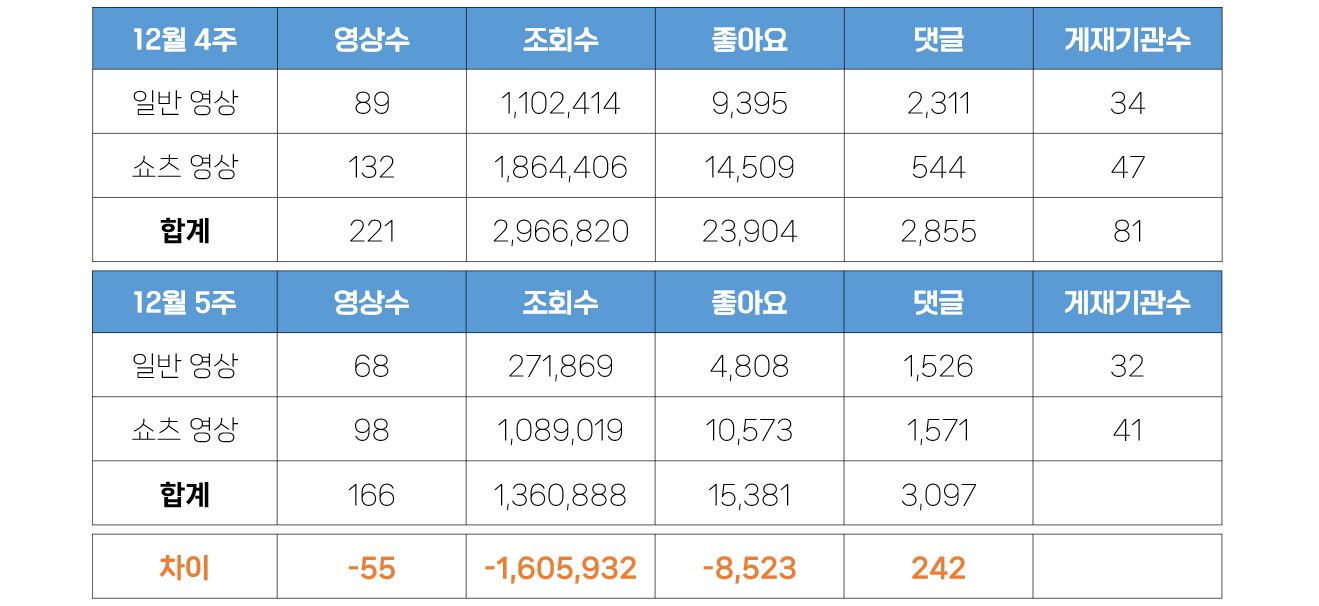 *숏폼드라마를 다른 기관에서는 쉽게 볼 수 없어 관심이 가면서도, 자주 볼 수 있는 일반적인 숏폼드라마의 구성과는 다르게 일반 웹드라마의 형태를 띄고 있어 다소 아쉬운 부분이 있기도 합니다. - 더불어 조회수 상위 3건의 영상이 모두 쇼츠영상으로, 이들 영상이 12월 5주 쇼츠영상의 전체 조회수에 큰 영향을 미친 것으로 나타났습니다.