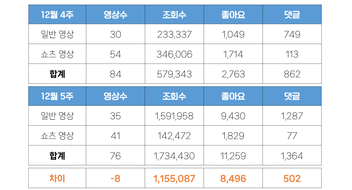 - 조회수의 경우, 영상 수가 감소한 것과 달리 지난 주 대비 110만 회 상승한 것으로 나타났습니다. 이는 경기도에서 게재한 '모두의 카드' 홍보 영상이 60만 회 이상의 조회수를 기록했기 때문입니다. 다만, 모두의 카드가 조회수를 견인한 것과는 달리 좋아요와 댓글 수에서는 큰 영향을 미치지 못했습니다. 더불어 일반영상의 좋아요와 댓글 수 역시 크게 증가했습니다. 이와는 달리 쇼츠영상에서는 전반적으로 큰 성과를 보여주지 못하고 있습니다. 특히 댓글의 경우에는 100개 이하로 감소하는 모습을 보여주기도 했습니다.