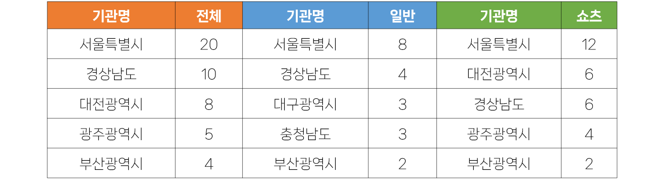 - 전체영상 중에서는 서울특별시가 20건으로 가장 많은 영상을 게재했습니다. 이 중 일반영상은 8건, 쇼츠영상은 12건으로, 서울시는 전체영상 뿐만 아니라 일반영상과 쇼츠영상에서도 가장 많은 영상 수를 기록했습니다. 이는 서울시가 많은 영상을 제작하는 것도 있지만, 12월 5주에는 다른 기관에서 상대적으로 영상을 적게 올린 영향도 있어 보입니다.