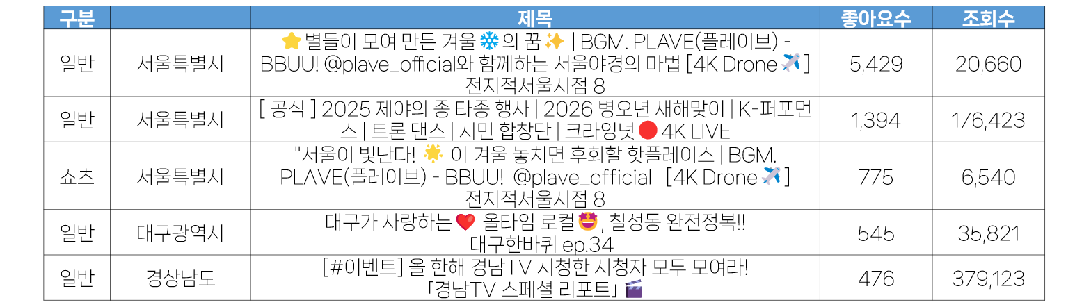 - 12월 5주 가장 많은 좋아요 수를 기록한 영상은 서울시 <⭐별들이 모여 만든 겨울❄️의 꿈✨ | BGM. PLAVE(플레이브) - BBUU! @plave_official와 함께하는 서울야경의 마법 [4K Drone✈] 전지적서울시점 8>로, 수집일 기준 5400개 이상을 기록했습니다. 조회수에 비해 매우 높은 좋아요 수치로, 플레이브의 영향이 큰 것으로 보입니다. 전반부에 플레이브가 등장하여 주목을 끌고, 이후 높은 퀄리티의 영상으로 관심을 꾸준히 이끌어 내고 있습니다.