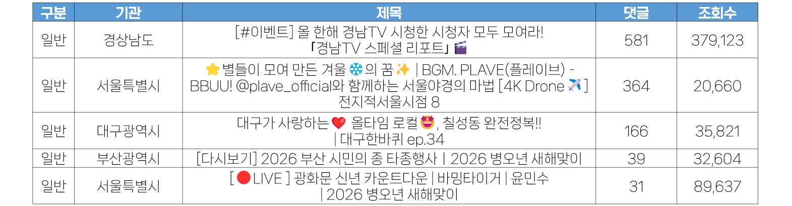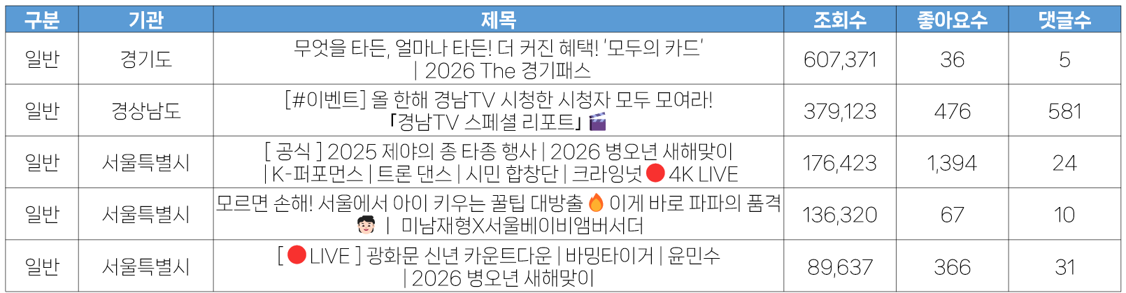 - 12월 5주 광역자치단체 유튜브 채널에 게재된 영상의 조회수 분석 결과, 경기도 <무엇을 타든, 얼마나 타든! 더 커진 혜택! ‘모두의 카드’|2026 The 경기패스> 영상이 수집일 기준 60만 회로 가장 많은 조회수를 기록했습니다. 이는 12월 5주 잉크닷이 모니터링한 영상 중에서도 가장 높은 조회수 수치입니다. 경기도에서 큰 규모로 광고를 집행한 결과로 보이며, 아쉬운 점은 높은 조회수와 달리 좋아요와 댓글 수가 매우 낮다는 점입니다.