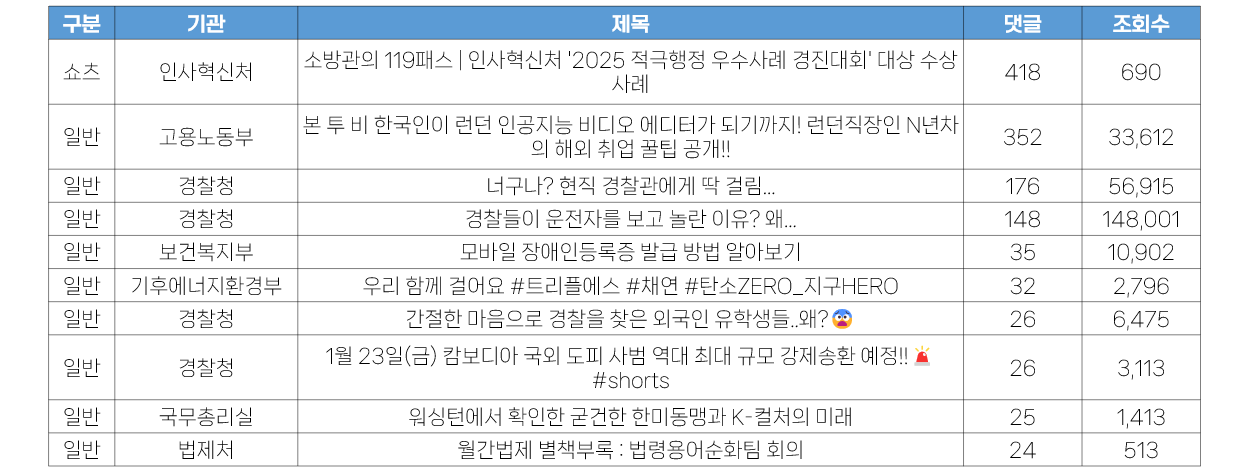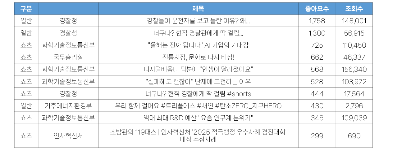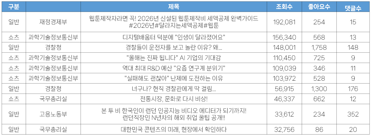 - 이와 함께 과학기술정보통신부의 쇼츠영상 4건이 상위에 오른 것이 눈에 띕니다. 이는 <국민들이 말하는 2026 과학기술·AI 주요 정책!> 일반영상 중에서 국민의 인터뷰 부분만 짧게 재편집한 것으로, 해당 영상의 조회수와 함께 좋아요 수도 높은 것이 인상적입니다.