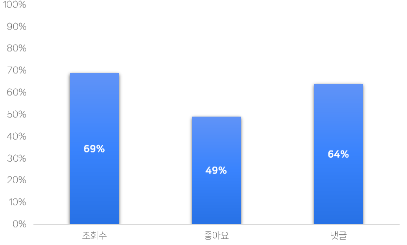 - 추가로 에디터가 각 상세 수치별로 상위 10개 영상의 합계를 전체 수치와 비교해봤습니다. 조회수의 경우 상위 10개 영상이 전체 조회수의 69%를 차지하는 것으로 나타났으며, 좋아요 수는 49%, 댓글 수는 64%를 차지했습니다. 1월 3주에 수집된 중앙행정기관 유튜브 채널의 영상은 228건입니다. 단 10건의 영상이 조회수 등의 상세 수치의 절반을 넘는 비중을 차지하고 있었습니다.