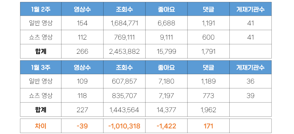- 조회수 등의 상세 수치를 살펴보면, 우선 조회수가 지난 주 대비 100만 회 감소했습니다. 일반영상에서 100만 회가 감소한 것을 확인할 수 있는데, 상세 분석에서 살펴보겠지만, 이번 주에는 유난히 높은 조회수의 영상이 그 어느 때보다 적은 것을 확인할 수 있습니다. 그것도 과학기술정보통신부의 쇼츠영상을 제외하면 조회수가 큰 폭으로 낮아질 것으로 보입니다. 조회수의 감소와 함께 좋아요 수 역시 감소한 반면, 댓글 수는 소폭 증가했습니다. 좋아요 수는 조회수와 다르게 일반영상에서 증가, 쇼츠영상에서 감소하는 모습이었습니다. 1월 3주에 게재한 영상이 쇼츠영상의 조회수를 끌어올리긴 했으나, 그리 매력적인 소재는 아니었다 라고 분석해볼 수 있겠습니다. 댓글은 쇼츠영상에서 소폭 상승했습니다.