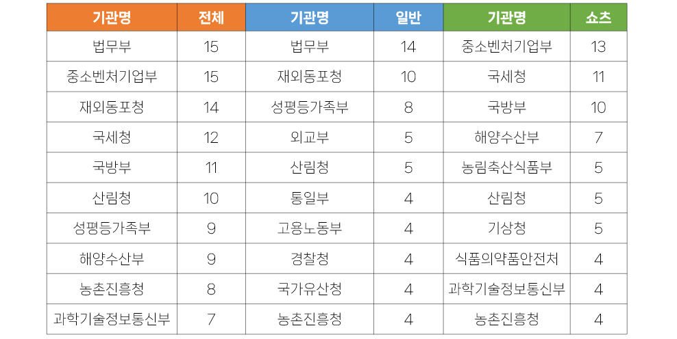 어떤 영상이 이용자들의 알고리즘에 노출될지 모르는 상황에서 이렇게 동일한 소재로 제작한 다수의 영상을 게재하는 것으로 짐작할 수 있습니다. 하지만 이는 하나의 소재가 지속적으로 이어져 이용자들에게 꾸준히 이어지기 보다는 일시에 사라지는 단점이 있습니다. 운영에 고민이 필요할 것으로 보입니다. 더불어 연예인이 출연하는 영상인만큼 비용도 만만치 않았을텐데, 이렇게 짧게 소비되는 게 다소 아쉽기도 합니다. 최소한 이벤트 등의 추가적인 활동이 이어졌으면 좋았겠다 라는 생각입니다. - 일반영상은 법무부가 14건으로 가장 많았으며, 쇼츠영상은 중소벤처기업부가 13건으로 가장 많았습니다. 중소벤처기업부의 경우 장관의 현장동정 쇼츠영상도 많았지만, 디지털소통팀 자체 제작하는 밈 쇼츠와 정보 전달 목적으 쇼츠 등 다양한 형태를 보여주었습니다.