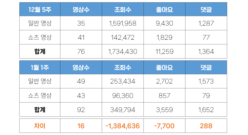 - 영상 수의 증가에도 불구하고 조회수와 좋아요 수는 감소, 댓글 수는 크게 감소했습니다. 조회수의 경우에는 일반영상에서 130만 회가 감소했으며, 좋아요 역시 일반영상에서 약 7000개 감소했습니다. 지난 주 경기도에서 게재한 모두의 카드 홍보영상이 조회수에 큰 영향을 미쳤지만, 이번 주에는 그 정도의 영향력을 미칠만한 영상이 없었다고 이야기 할 수 있습니다. 즉, 이번 주의 수치가 광역자치단체 유튜브 채널의 평소 수치라고도 볼 수 있는데, 개별 영상의 평균 조회수를 살펴보면 3,800회에 불과했습니다.