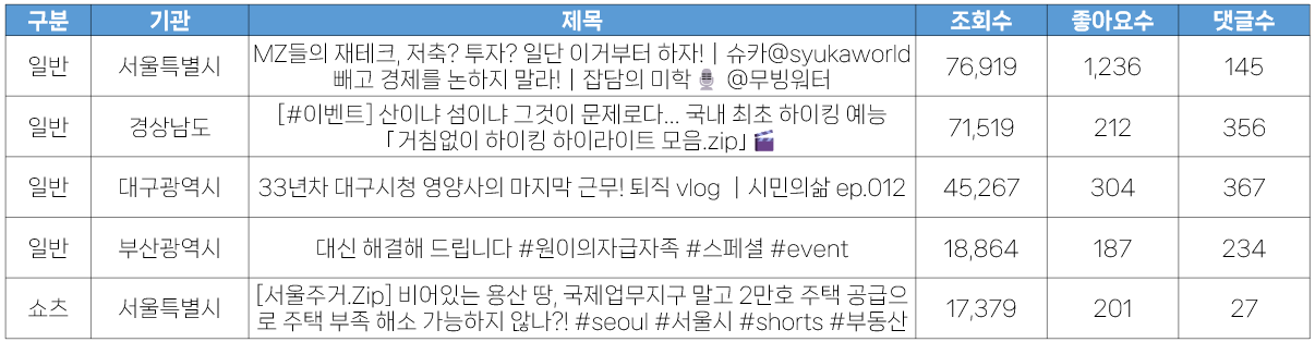 - 일반영상과 쇼츠영상에서는 지난 주와 마찬가지로 서울시가 가장 많은 영상 수를 기록했습니다.
