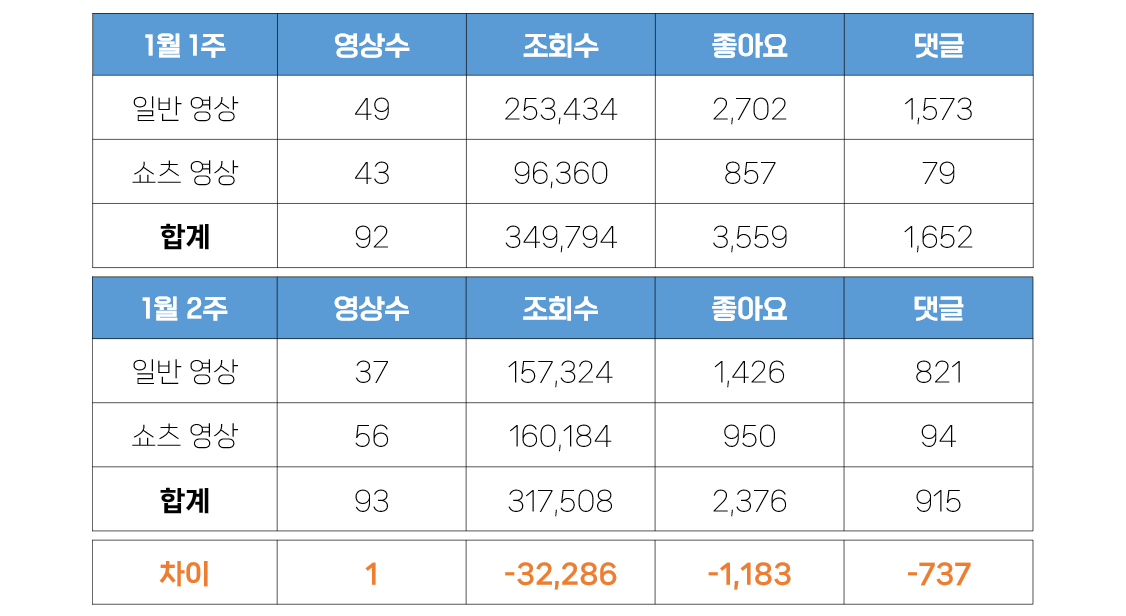 - 상세수치를 보면 전체적으로 조회수 등의 수치는 큰 감소세를 보여주었습니다. 일반영상에서 크게 감소했기 때문으로 조회수 등의 수치 성과를 이끌어 낼만한 매력을 가진 영상이 부족했다고 이야기 할 수 있습니다. 쇼츠영상은 조회수가 크게 증가한 것과는 달리 좋아요와 댓글의 증가세는 크지 않았습니다. 쇼츠영상 역시 소재의 매력도가 낮다 라고 이야기 할 수 있습니다.
