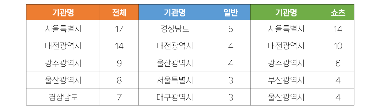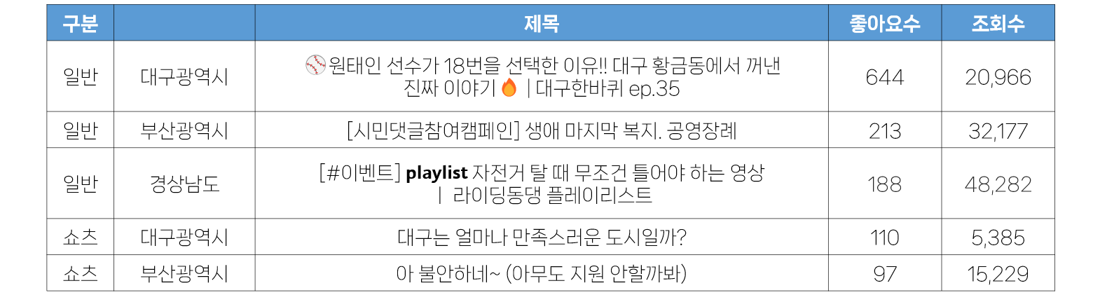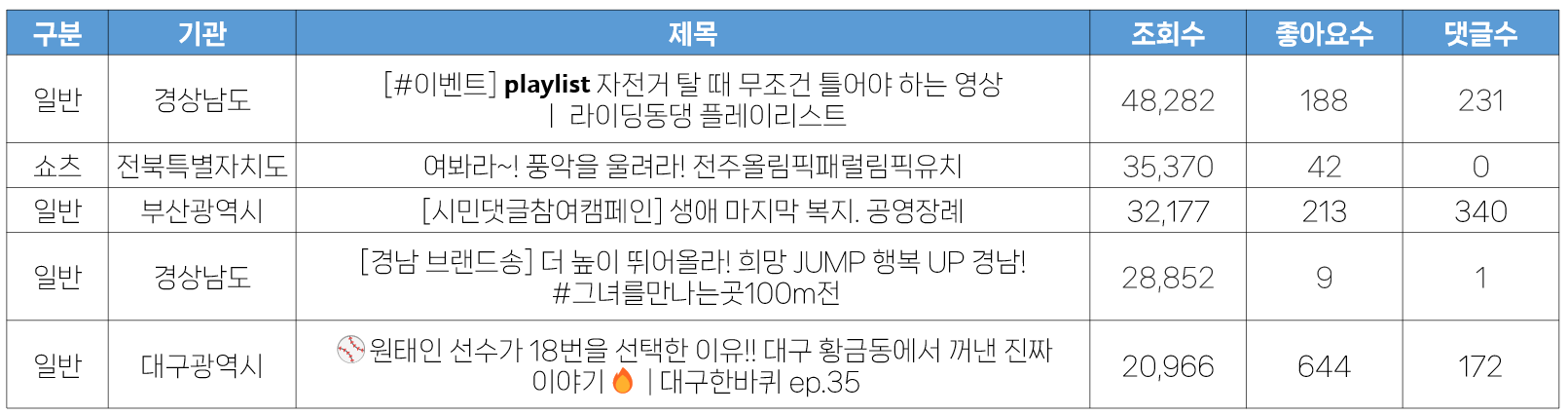 - 일반영상은 경상남도가 5건으로 가장 많았습니다. 이번 주에는 유난히 많은 영상을 게재한 기관이 보이지 않았습니다. 하지만 쇼츠영상의 경우 서울특별시 14건, 대전광역시 10건으로 쇼츠영상 게재는 매우 활발했습니다.