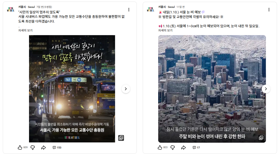 이렇게 영상을 만들고 있는 와중에 게시물 운영에도 매우 진심입니다. 올라온 게시물을 보면 영상을 예고하는 게시물 외에도 서울시 관광지 소개, 서울시 정책 정보 그리고 급한 공지 등 다양한 내용의 게시물이 게재된 것을 확인할 수 있습니다. 꾸준히 운영한 덕분인지 이들 게시물에 대한 반응도 적지 않습니다. 시내 버스 파업과 관련된 게시물의 경우 좋아요는 무려 1.1천개나 됩니다.