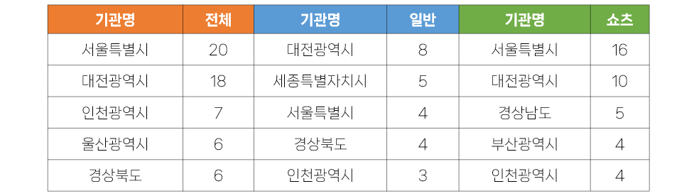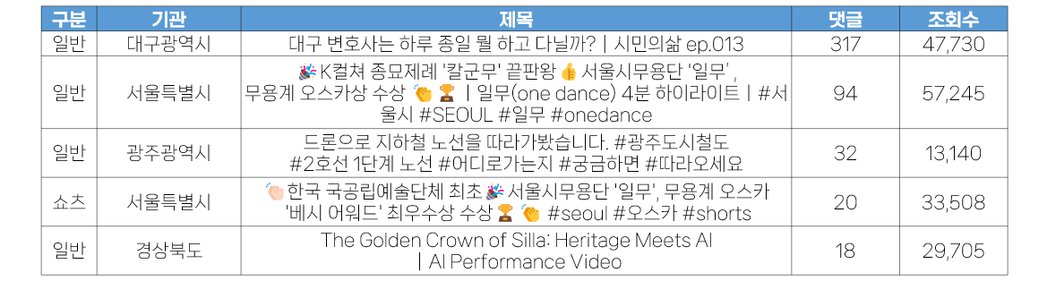 - 일반영상은 대전시가 8건으로 가장 많았으며 쇼츠영상은 서울시가 16건으로 가장 많았습니다.