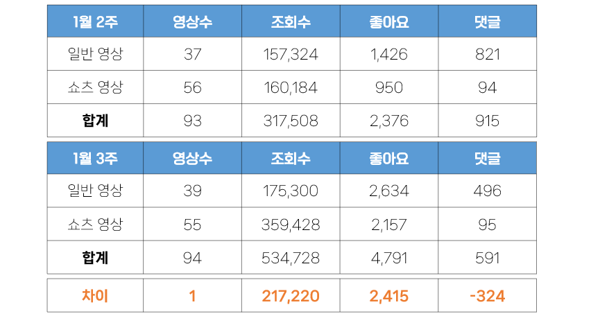- 이를 종합해보면, 쇼츠영상의 경우 광고를 진행하든, 진행하지 않든 조회수와 좋아요 수 유도까지는 매우 용이하기에 높은 수치를 기록할 수 있었지만, 댓글 유도에는 한계가 있기 때문에 댓글로 수치 성과가 이어지지 못했다고 볼 수 있습니다. 더불어 일반영상에서도 조회수, 좋아요 수가 증가했지만 댓글 수가 지난 주 대비 절반 수준으로 감소한 것을 확인할 수 있는데, 이는 연계 이벤트의 감소와 댓글과 같은 적극적 참여를 유도할 소재의 부재 등으로 분석할 수 있습니다.