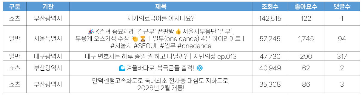 - 2026년 1월 3주 광역자치단체 유튜브 채널에 게재된 영상의 조회수 분석 결과, 부산광역시의 <재가의료급여를 아시나요?> 영상이 수집일 기준 142,515회로 가장 많았습니다. 쇼츠영상이기 때문에 댓글이 적은 것은 어느 정도 이해하지만, 조회수와 좋아요 수에 비해 댓글이 너무 없는 건 아쉬운 부분입니다.