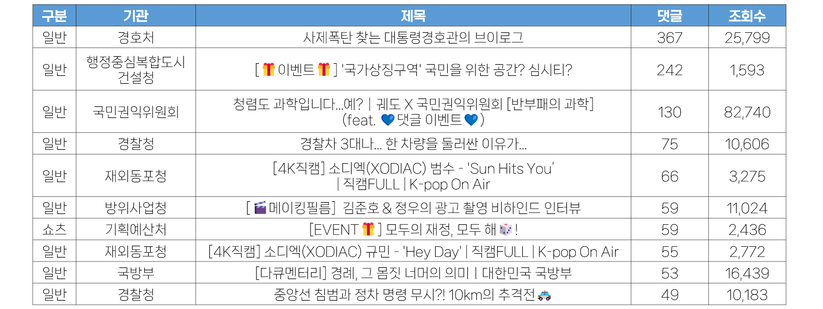- 1월 4주 가장 많은 댓글의 영상은 경호처 <사제폭탄 찾는 대통령경호관의 브이로그>으로, 수집일 기준 367개를 기록했습니다. 좋아요 수에 이어 댓글에서도 꾸준히 좋은 반응을 이끌어 내고 있는 영상 시리즈입니다. 이벤트를 진행하지 않음에도 이 정도의 댓글을 확보하는 건 매우 고무적인 부분으로, 다른 부처에서도 참고해야 할 부분입니다. 경호처의 경우 단지 영상 게재에만 집중하는 것이 아니라 게시판을 통해서도 매우 활발하게 소통하는 모습을 보이고 있습니다.