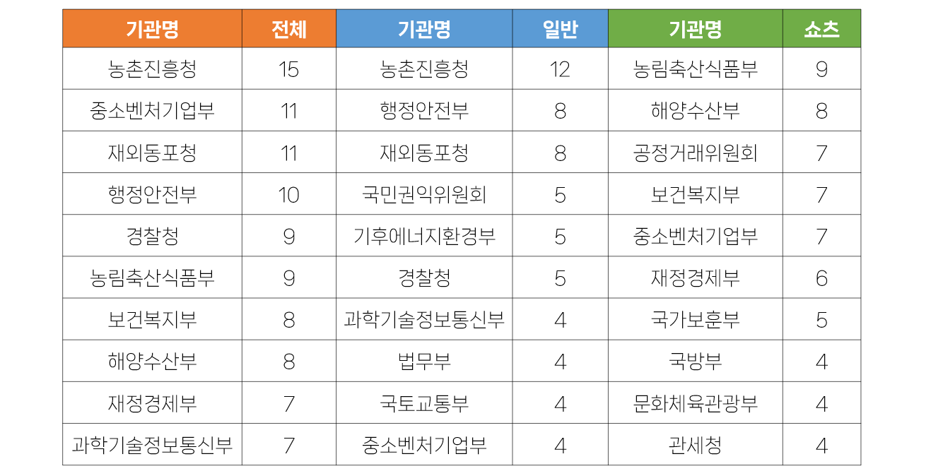 - 일반영상은 농촌진흥청이 12건으로 가장 많았으며, 쇼츠영상은 농림축산식푸부가 9건으로 가장 많았습니다.
