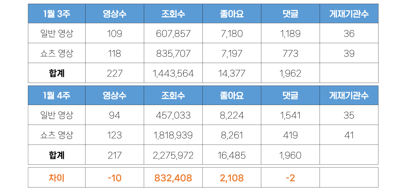 - 일반영상의 경우 영상수, 조회수가 감소했지만 좋아요 수와 댓글 수는 오히려 증가했습니다. 이는 매우 이례적인 현상으로, 일반영상 중 이용자들의 반응을 적극적으로 유도하는 요소가 다분히 포함되어 있음을 알 수 있습니다. 조회수의 감소에도 좋아요 수 등 반응 지수의 증가는 매우 긍정적으로 바라볼 수 있는 부분입니다. 상세분석에서 어떤 영상이 이러한 흐름을 견인했는지 살펴보도록 하겠습니다.
