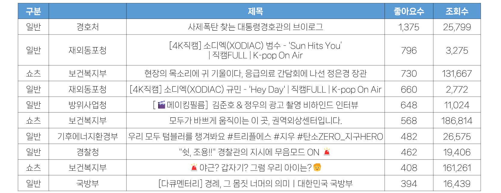 - 또 하나 주목해야 할 부분은 상위 10개 영상 중 쇼츠영상이 무려 9개나 차지하고 있는 것입니다. 중앙행정기관 유튜브 채널의 영상 운영이 쇼츠가 중심이 되고 있는 가운데, 조회수에서도 쇼츠의 영향력이 커지고 있습니다. 정책의 핵심만 빠르게 전달할 수 있다는 점, 쇼츠의 노출 알고리즘이 무작위 노출이라는 점 등을 감안할 때 쇼츠에 집중하는 운영은 계속 될 것으로 보입니다.
