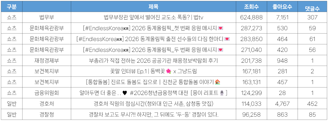 - 이와 함께 최근 밀라노에서 진행 중인 동계올림픽과 관련된 응원 메시지를 전달하는 문화체육관광부의 쇼츠영상도 매우 많은 조회수를 기록했습니다.
