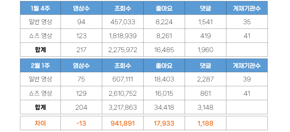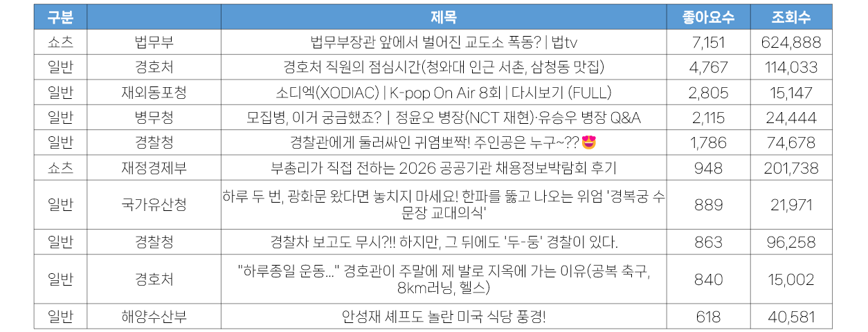 - 상세수치를 보면, 조회수의 경우 전 주 대비 94만 회 증가했습니다. 일반영상과 쇼츠영상에서 모두 증가했는데 특히 쇼츠영상의 상승 폭이 더 컸습니다. 이는 법무부, 문화체육관광부 일부 부처에서 게재한 쇼츠 영상이 다수 조회수 상위에 올랐기 때문입니다. 특히나 법무부의 쇼츠영상 1건이 60만 회 이상 조회수를 기록하며 전체 조회수에 큰 영향을 미쳤습니다.
