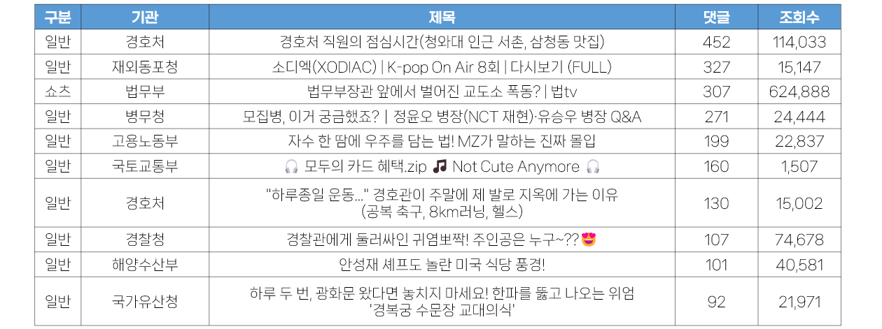 - 이 두 건의 영상이 가진 공통점은 바로 광고를 하지 않은 영상임에도 좋은 수치 성과를 기록했다는 점입니다. 더불어 아이돌이 출연한 재외동포청의 영상과도 달리 대중적으로 유명한 인물이 출연하지 않았다는 것도 주목할 부분입니다. 일반 대중이 관심을 가질 소재를 찾고 부처에 맞게 영상 콘텐츠를 구성하는 것이 얼마나 중요한 것인지를 알 수 있습니다.