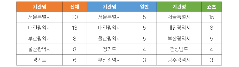 - 전체영상 중에서는 서울특별시가 20건으로 가장 많은 영상 수를 기록해습니다. 서울시는 일반영상과 쇼츠영상에서도 가장 많은 영상 수를 기록했습니다. 뒤를 이어 대전광역시가 13건이었습니다.