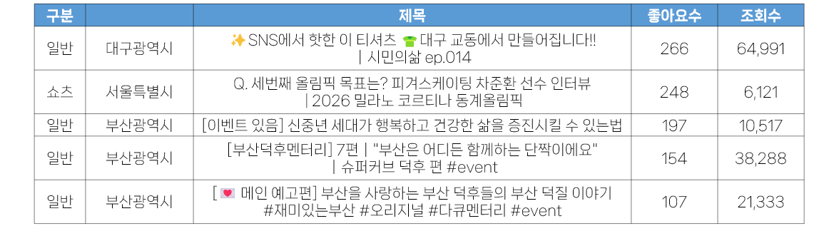 [2026년 2월 1주] 지자체 ㅣ 대구시 '휴먼다큐' 시리즈 영상이 꾸준히 인기입니다