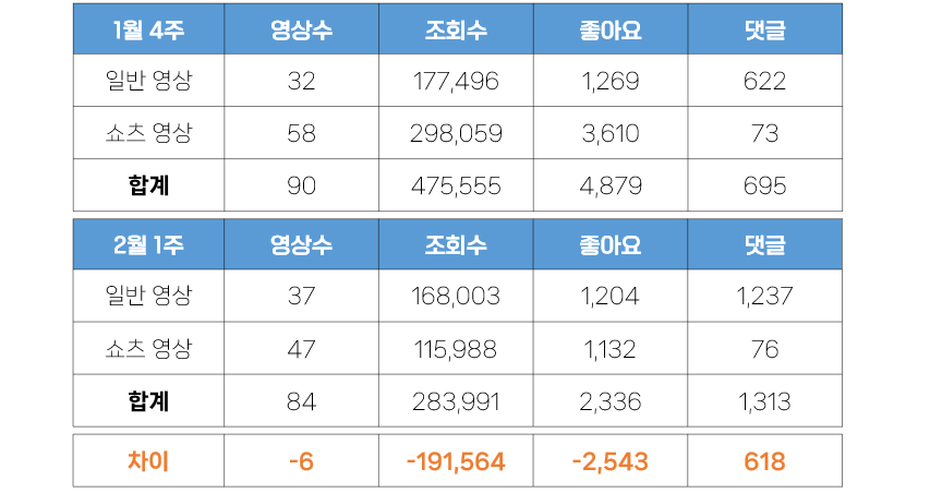 - 상세 수치를 보면, 조회수는 지난 주 보다 약 20만 회 감소했습니다. 일반영상과 쇼츠영상에서 모두 감소한 것을 확인할 수 있는데, 쇼츠영상에서 크게 감소했습니다. 좋아요 역시 감소했습니다. 하지만 좋아요는 일반영상은 지난 주와 거의 동일한 수치를 유지한 것과 달리 쇼츠영상에서 2000개 이상 감소하는 모습을 보여주었습니다. 전반적을 영상 수의 감소와 함께 게재된 쇼츠영상의 매력도도 떨어지기 때문에 조회수와 좋아요 수도 함께 감소했다고 분석해볼 수 있습니다.
