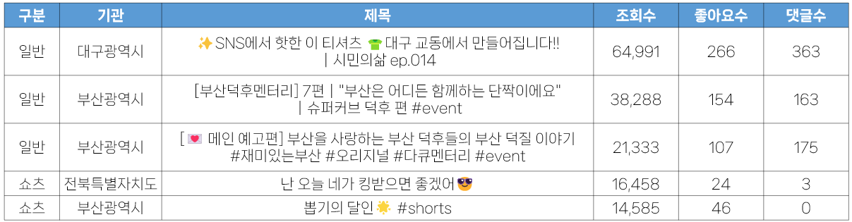 - 일반영상 중에서는 서울특별시, 대전광역시, 울산광역시가 5건을 게재했습니다. 쇼츠영상은 서울시가 15건을 게재해 가장 많은 수치를 기록했습니다.