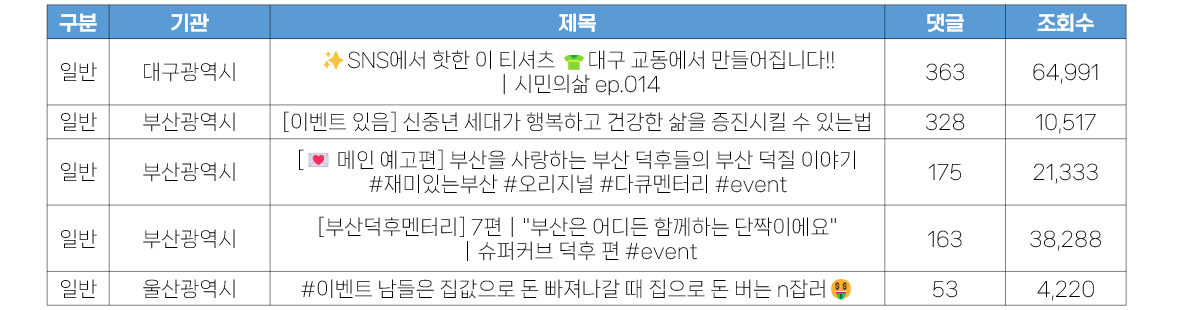 - 2월 1주 광역자치단체 유튜브 채널에 게재된 영상의 조회수 분석 결과, 대구광여시 <✨SNS에서 핫한 이 티셔츠 👕대구 교동에서 만들어집니다!!|시민의삶 ep.014> 영상이 수집일 기준 6.4만회로 가장 많은 수치를 기록했습니다. 해당 영상은 이벤트와 광고집행을 통한 수치성과 확보와 함께 꾸준히 진행해오는 시민의 삶 시리즈에 대한 이용자들의 관심이 다수 반영된 것으로 보입니다. 대구시는 시민의 삶을 있는 그대로 보여주는 휴먼다큐 스타일의 영상 시리즈를 꾸준히 추진하여, 대구시만의 콘텐츠로 확립하는 중입니다. 해당 영상은 조회수는 물론 좋아요, 댓글 수에서도 가장 많은 수치를 기록했습니다.